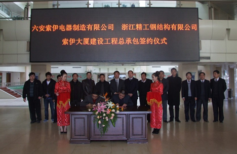 2011年2月23日上午11時,六安索伊電器制造有限公司與浙江精工鋼結構有限公司在六安經(jīng)濟技術開發(fā)區(qū)管委會就索伊大廈建設工程總承包正式簽訂合作協(xié)議。