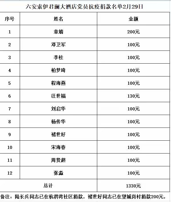 眾志成城,共克時艱,愛心匯聚,暖流涌動。新型冠狀病毒感染的肺炎疫情牽動人心,為打贏疫情防控阻擊戰(zhàn),積極響應六安開發(fā)區(qū)非公企業(yè)黨組織的號召,29日上午接到上級黨組織的捐款通知后,索伊公司廣大黨員積極響應。由于疫情尚處在關鍵時刻,企業(yè)仍然沒有大面積的復工,很多的黨員還沒有來公司上班。但這絲毫不影響廣大黨員奉獻自己的愛心,公司黨委立即起草了倡議書,并分別發(fā)送在公司“索伊電器黨委支委群”和“索伊學習強國分享群”里。倡議書發(fā)出不到一分鐘,黨委委員莊敏妮的手機收到的第一筆100元的捐款是黨員江開勝的,的確是聞風而動,捐款速度讓大家興奮。緊接著全公司六個支部都活躍起來了,手機匯款提示音此起彼伏,大家紛紛通知微信或支付寶踴躍捐款,30、50、100、200、500、1000、2000元發(fā)送到統(tǒng)一賬戶,讓我們感到自豪的是廣大黨員的自覺性和積極性是如此之高。其實部分普通黨員的工資并不算高,有的困難黨員沒有要求捐款,全憑自覺自愿,但賈承忠、羅永春等都主動要求捐款,以表達他們的一片愛心。興大黨支部一直是公司里的先進黨支部,各項工作總是走在前列,倡議書一發(fā)出,黨員黃齊瑋主動捐款2000元,黨支部書記冉勝利是一名退伍老兵,主動捐款1000元,讓我們非常的感動。打電話告訴他們不必捐那么多,他們都笑著說:“不算多,不算多,疫情無情人有情,獻愛心是善舉、是一種回報,更是責任,我們沒有到抗擊一線,但看到那么多的醫(yī)務人員和志愿者沖在疫情一線無私無畏,作為黨員我們捐款也是應該的?!睒銓嵉脑捳Z也印證了優(yōu)秀黨員的風采。一個先進典型就是一面旗幟,在他們的影響和帶動下,興大黨支部共計11人,捐款4550元。興大黨支部還把去年底公司黨委獎勵給先進黨支部所剩獎勵金共計1500元也要捐了,通過與上級黨組織的溝通,此次捐款只以黨員的個人名義,不以集體的名義,希望他們留作以后黨支部活動用。這就是一個基層黨支部的工作熱情和工作力量,為他們點贊。同時這次捐款主要針對廣大基層黨員,但建黨積極分子周敏、肖斌、朱開琳也不甘落后,主動加入到捐款的隊伍中,表達自己的愛心。
