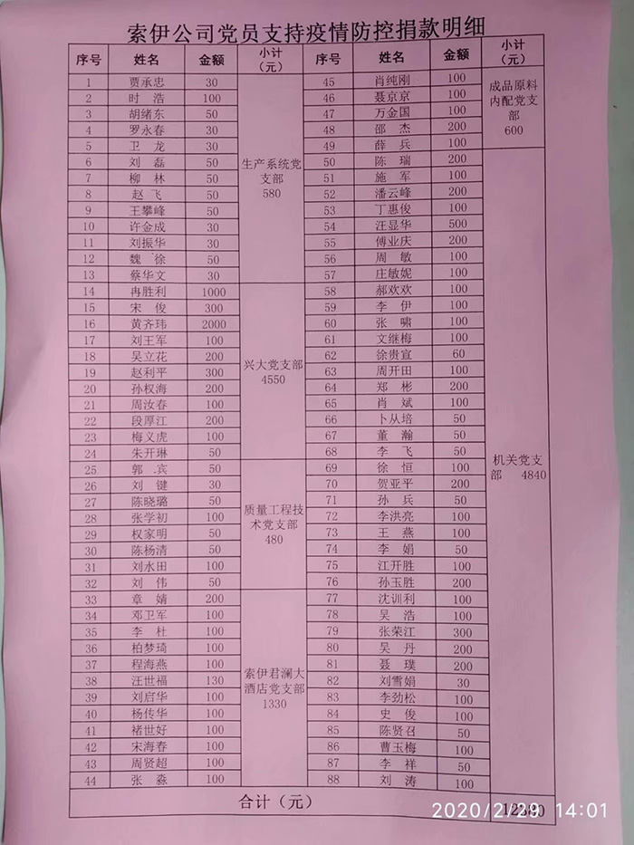 短短的半天時間,索伊廣大黨員共計捐款12380 元,其中機關黨支部捐款4840元,生產(chǎn)系統(tǒng)黨支部捐款580元,成品內(nèi)配原料黨支部600元,質(zhì)量工程技術黨支部捐款480元,興大公司黨支部4450元,索伊君瀾黨支部捐款1330元。一份份捐款帶著濃厚的情誼,一句句話語閃爍著黨性的光輝,匯聚成了索伊人的大愛無疆,形成了眾志成城抗擊疫情的濃厚氛圍,武漢,加油!中國,加油!沒有一個冬天不可逾越,也沒有一個春天不會到來!
