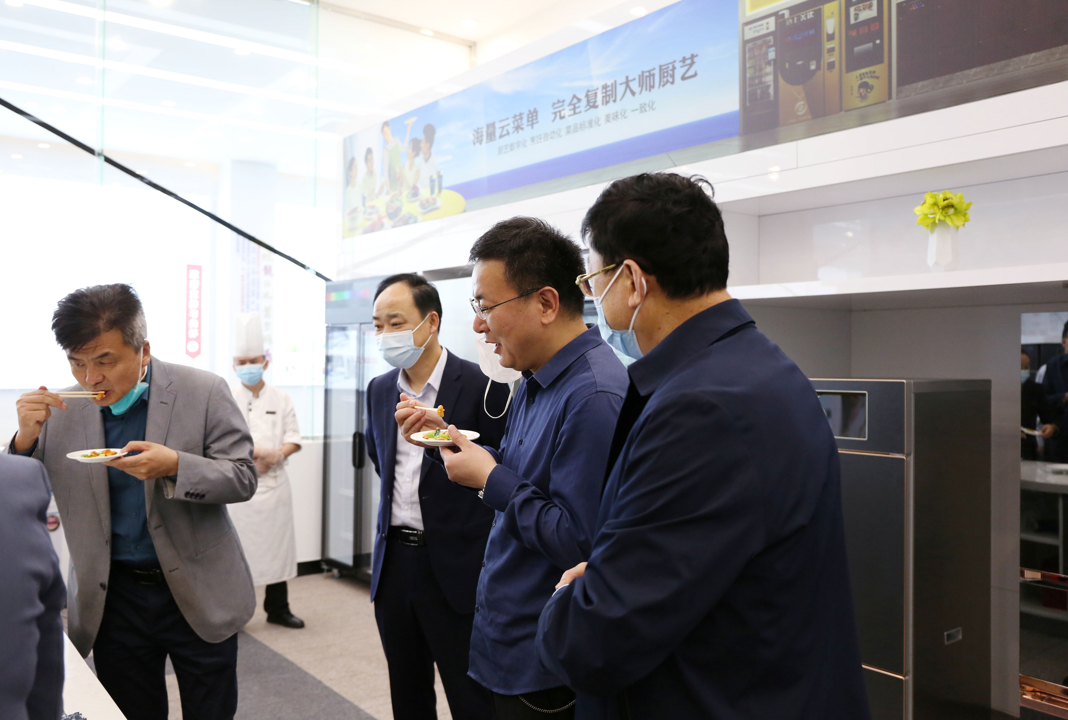 接著,黃院長(zhǎng)一行又來到公司的產(chǎn)品展示廳和轉(zhuǎn)型展示廳。集團(tuán)公司董事長(zhǎng)助理倪曙東向黃院長(zhǎng)一行重點(diǎn)介紹了索伊集團(tuán)的發(fā)展歷程。他聽后對(duì)索伊創(chuàng)新發(fā)展的路徑大為贊賞,對(duì)精準(zhǔn)總結(jié)智能制造餐飲行業(yè)發(fā)展“八化”趨勢(shì)給予充分肯定。在中央廚房的體驗(yàn)廳,現(xiàn)場(chǎng)觀看了無油煙、無明火、無污染、快捷環(huán)保的廚神和野牛機(jī)器人分別炒制的蔥爆河蝦和黑椒牛肉粒炒制過程。當(dāng)黃院長(zhǎng)一行品嘗菜品后更是贊不絕口,他深有感觸地說:“色香味俱全,口感很好,肉嫩細(xì)滑、咸淡精確適宜,很好吃?!边@臺(tái)野牛炒菜機(jī)器人,值得在學(xué)校食堂推廣使用,我希望以后我們有合作的機(jī)會(huì)。”