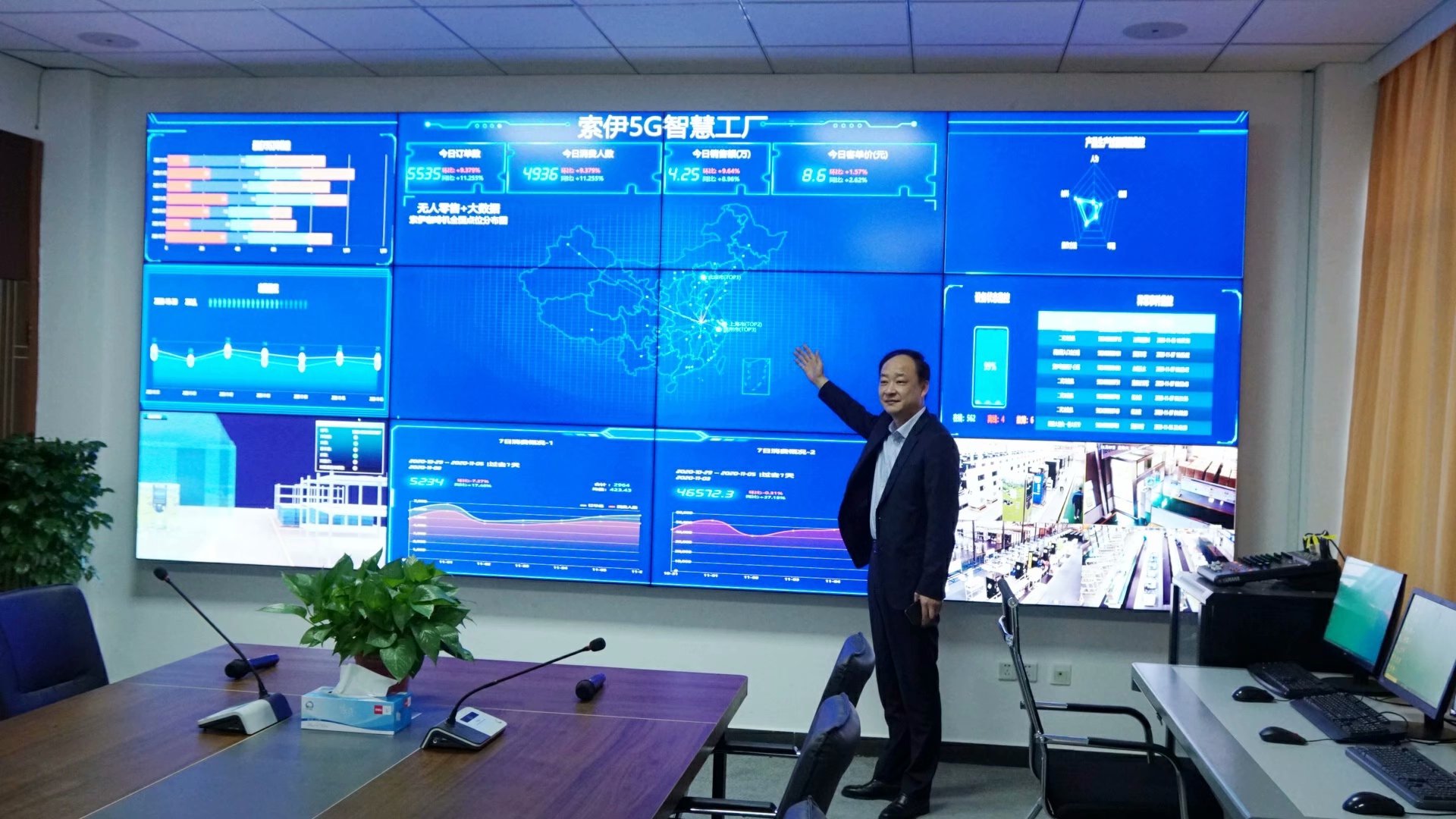 董事長助理倪曙東在5G智慧工廠控制室介紹5G項(xiàng)目