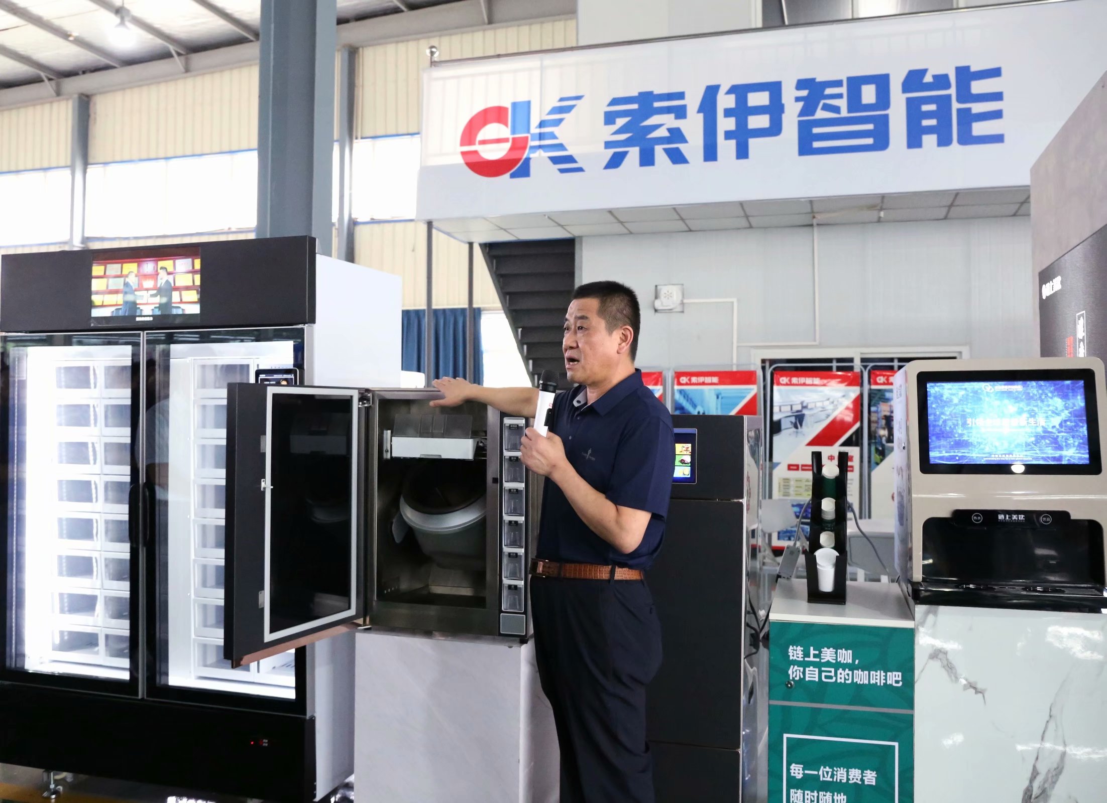接著又來到公司產(chǎn)品展示廳,由董事長助理倪曙東進行講解,倪總重點介紹了系列智能產(chǎn)品----智能格子柜、無人售賣柜、生鮮自提柜等,這些都是智慧餐廚項目工程的配套產(chǎn)品。
