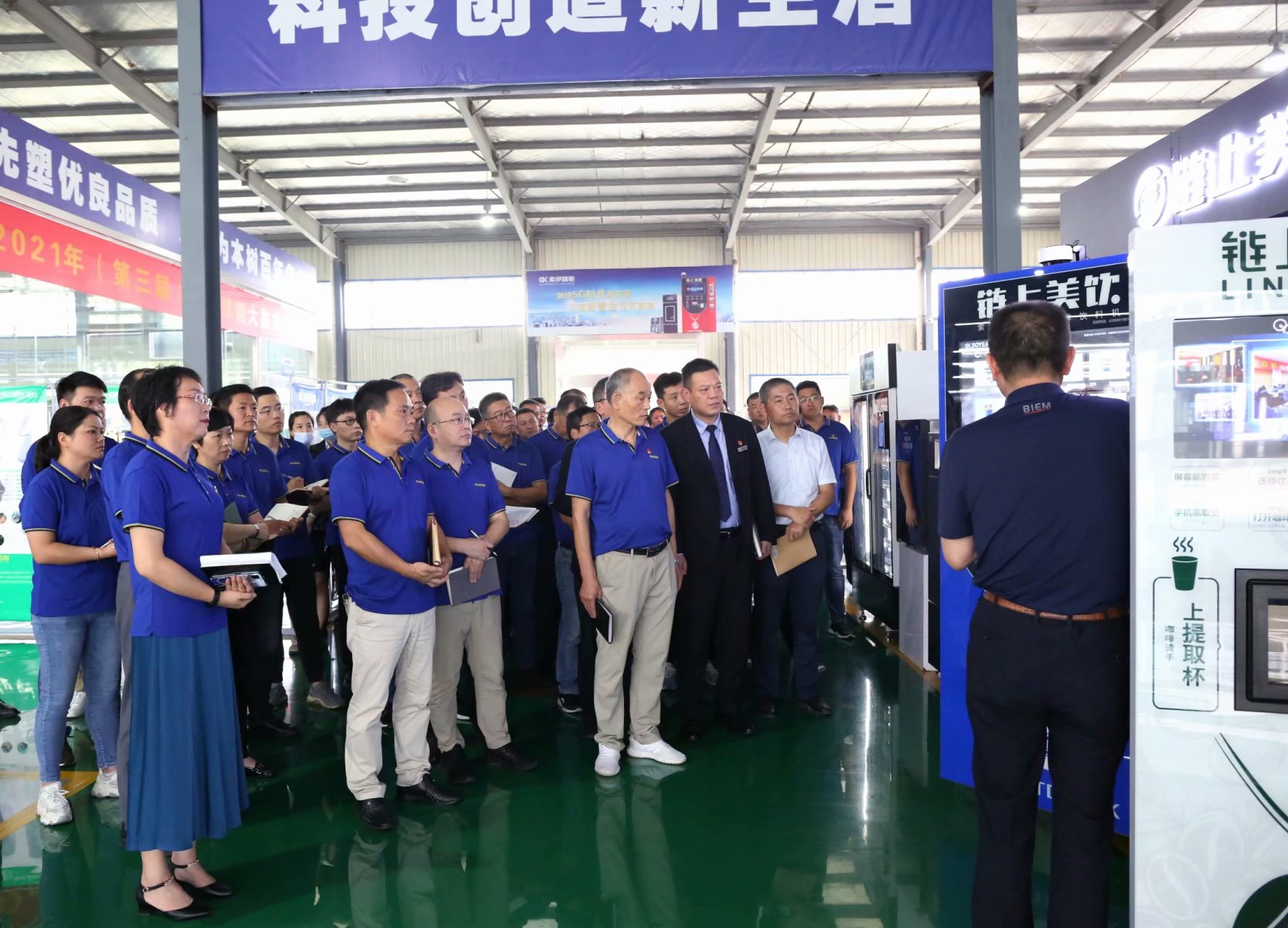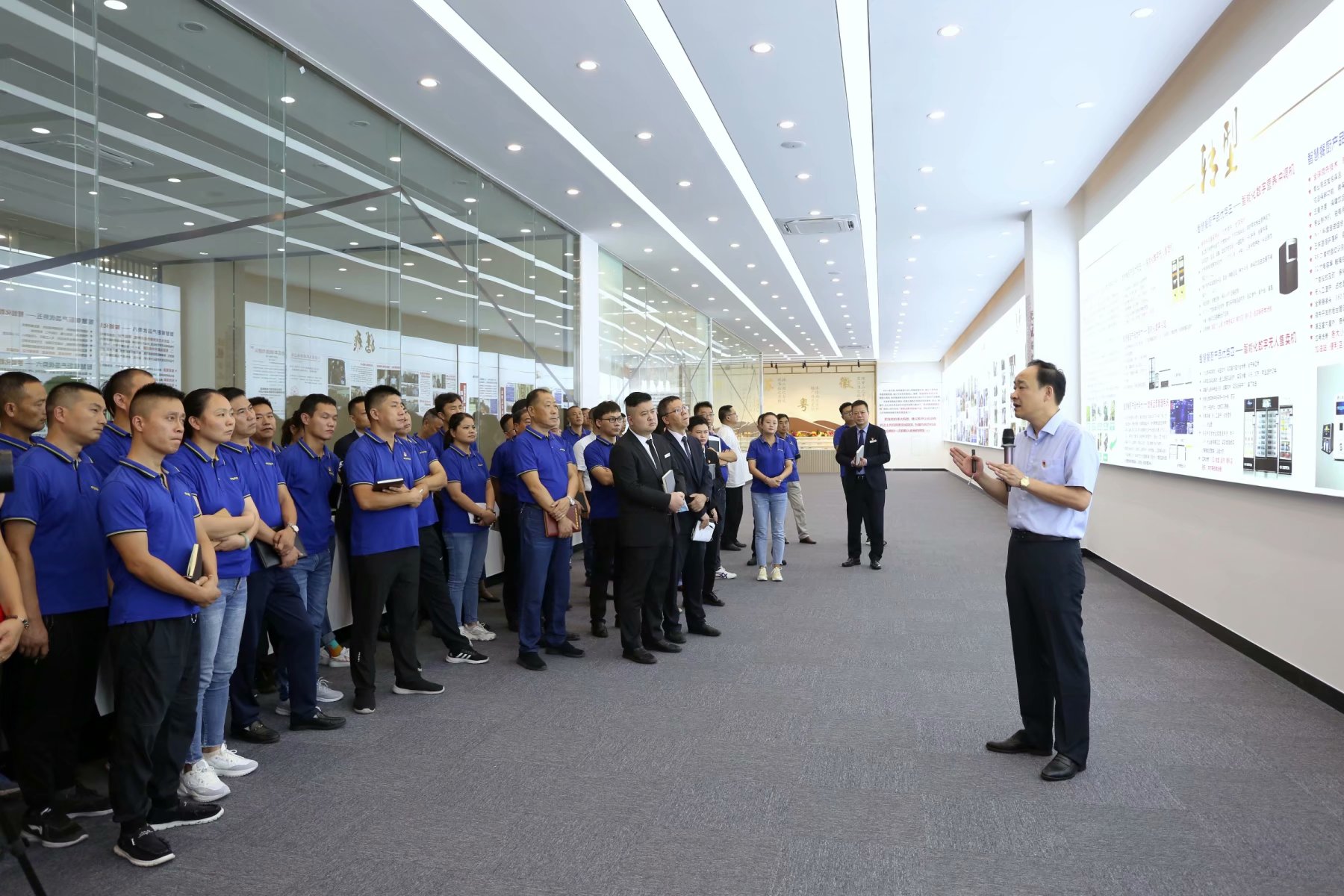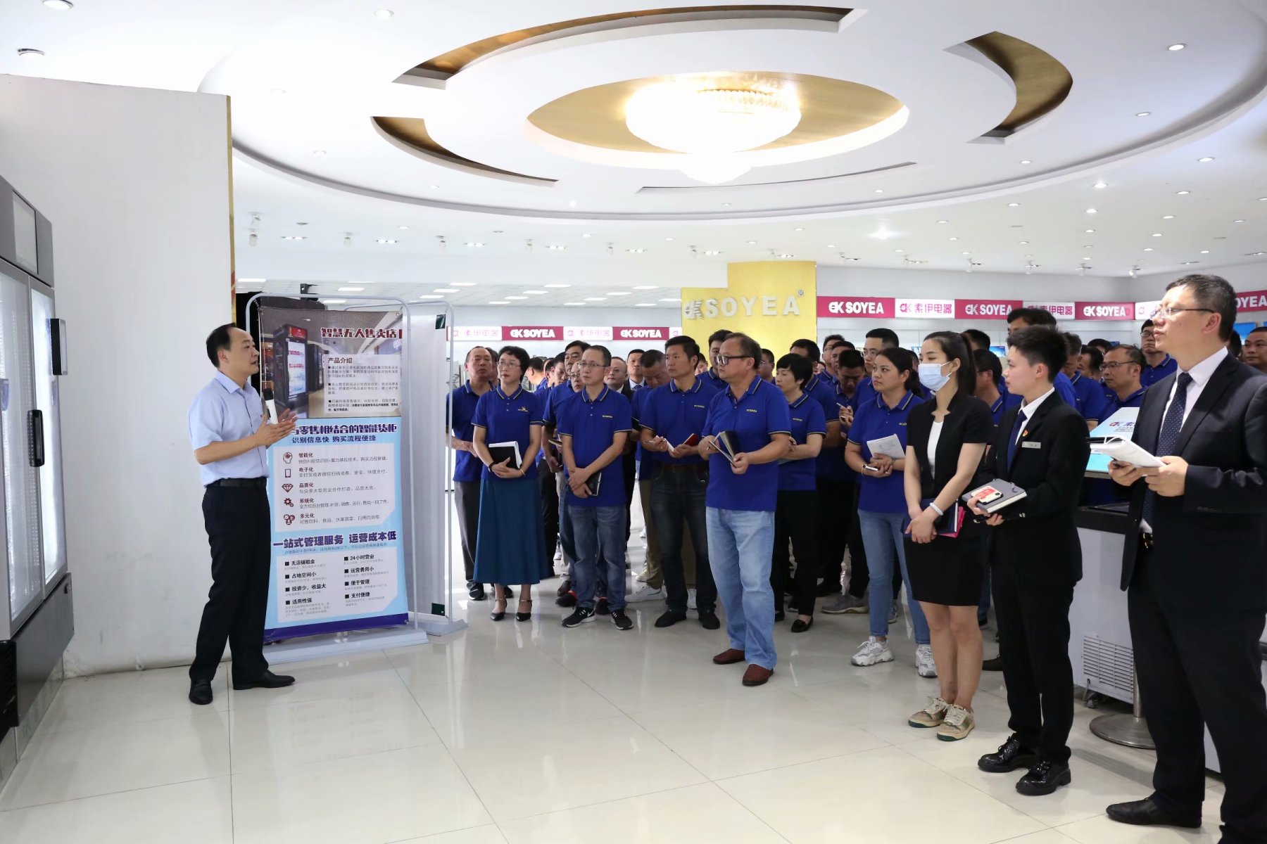 產(chǎn)品展廳中,董事長助理倪曙東為大家逐一介紹各類無人售賣產(chǎn)品知識及應(yīng)用場景