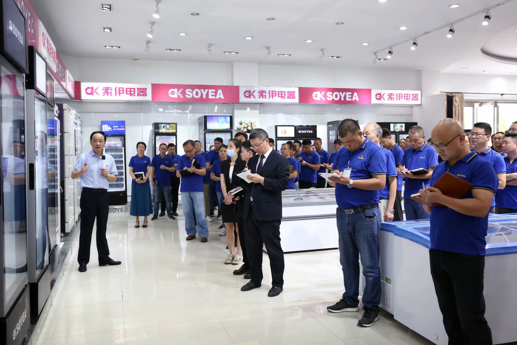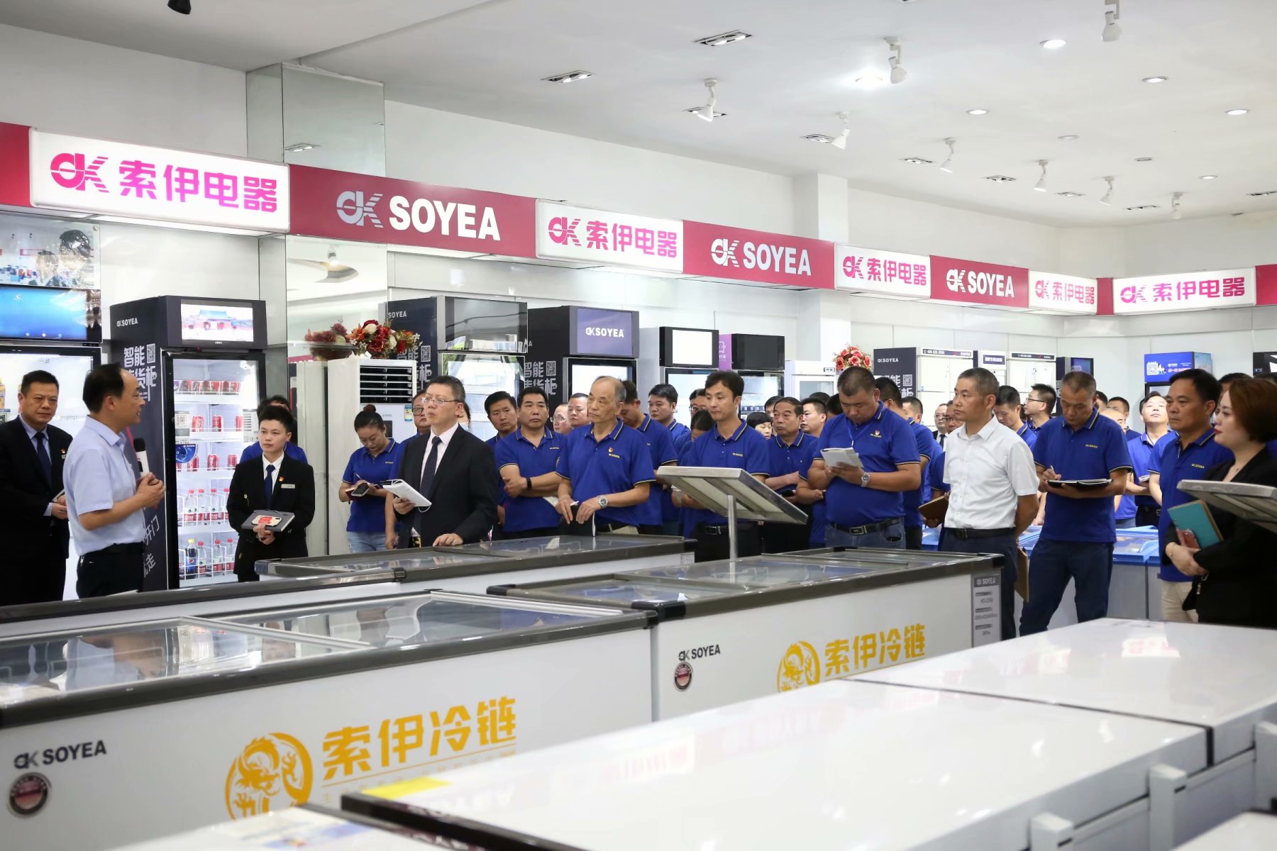 第二段議程就是參觀智能化試驗車間及索伊電器產(chǎn)品展示廳、索伊轉(zhuǎn)型展示廳。參會人員列隊來到智能化試驗車間,王董事長首先向大家介紹了世界首創(chuàng)、中國獨創(chuàng)的智能化數(shù)字烹飪機器人產(chǎn)品,并詳細(xì)介紹了此產(chǎn)品的八大優(yōu)勢,不僅廚藝數(shù)字化、烹飪自動化、菜品標(biāo)準(zhǔn)化、美味化、一致化,而且無油煙、無明火,全自動清洗,紫外線殺菌,同時可滿足家餐、堂餐、團餐等各種場景的運用,讓千人一味,一人千味的夢想成真。當(dāng)王董事長介紹到全球領(lǐng)先、擁有100多項國家專利的智能化數(shù)字機器人飲料機產(chǎn)品時,他的臉上更是洋溢出滿滿的自豪感,因為此產(chǎn)品具有五重殺菌,獨特的制冰技術(shù),四大飲品系列,海量飲品配方,全場景,滿足于室內(nèi)室外,各種高溫、高寒、高濕等環(huán)境全場景投放使用。