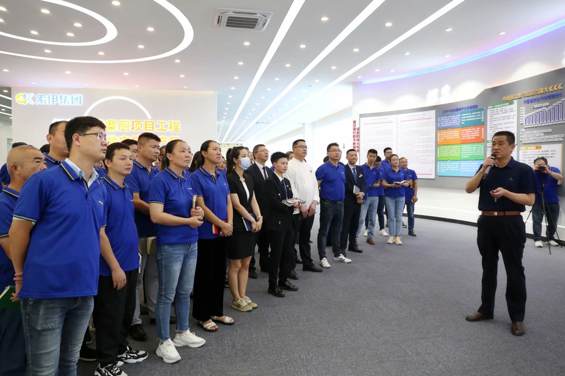 王瓊峰董事長在智能制造車間現(xiàn)場講解以烹飪機器人為代表的索伊各類智能數(shù)字化產(chǎn)品