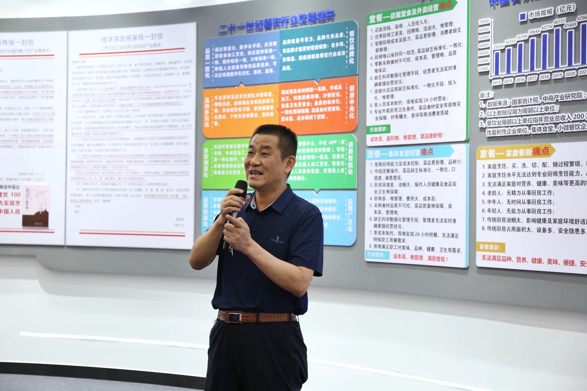 最后來到了剛剛新建的轉(zhuǎn)型展示廳,一進展示廳,主背景墻上的二行紅白鑲嵌的發(fā)光大字——“打造智慧餐廚項目工程,制造智能數(shù)字廚電產(chǎn)品”,顯得特別醒目,也突出了此展示廳的核心功能。王董事長從索伊集團的成立講起,二十多年來,索伊集團走過風(fēng)雨,走過輝煌,曾創(chuàng)造了家電下鄉(xiāng)期間索伊冰箱全國銷量第六名,位列民營企業(yè)前茅的奇跡。從2012年以后,企業(yè)不斷地探索,堅持走升級轉(zhuǎn)型之路,通過多年的探索,最終確定以“智慧餐廚項目工程”為核心的發(fā)展方向,以“智能化數(shù)字廚電新產(chǎn)品”研發(fā)、制造和應(yīng)用為核心打造智能化數(shù)字化產(chǎn)業(yè)集群,最終把錢學(xué)森在1995年提出的“烹飪工業(yè)化將出現(xiàn)在21世紀(jì)中國的第六次產(chǎn)業(yè)革命中”這一偉大構(gòu)想,通過索伊不斷的探索變成現(xiàn)實。王董事長也道出了探索的過程是漫長的,也是艱辛的,五年中企業(yè)尋找、洽談了100多個產(chǎn)業(yè)項目,最終創(chuàng)造性地總結(jié)出,隨著第四次工業(yè)革命到來,企業(yè)要想升級轉(zhuǎn)型,持續(xù)高速發(fā)展,必須具備八大要素,同時要選擇以四大“午陽”產(chǎn)業(yè)為發(fā)展方向。通過分析了家餐、堂餐、團餐的現(xiàn)狀和痛點,創(chuàng)造性提出了二十一世紀(jì)餐飲行業(yè)發(fā)展的八化趨勢,即“餐飲品牌化、廚房中央化、消費智能化、應(yīng)用廣泛化、品質(zhì)一致化、品種多元化、食安溯源化、運營標(biāo)準(zhǔn)化”,可謂是戰(zhàn)略眼光,思維超前,總結(jié)精辟,指導(dǎo)性強,可操作性強。更神奇的是王董事長的創(chuàng)舉與科學(xué)家錢學(xué)森的構(gòu)想不謀而合,并且實現(xiàn)了錢老的預(yù)言,這不得不說是一個神化。