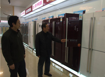 索伊黨建指導員李忠(圖右)向王源成書記(圖左)介紹索伊冰箱