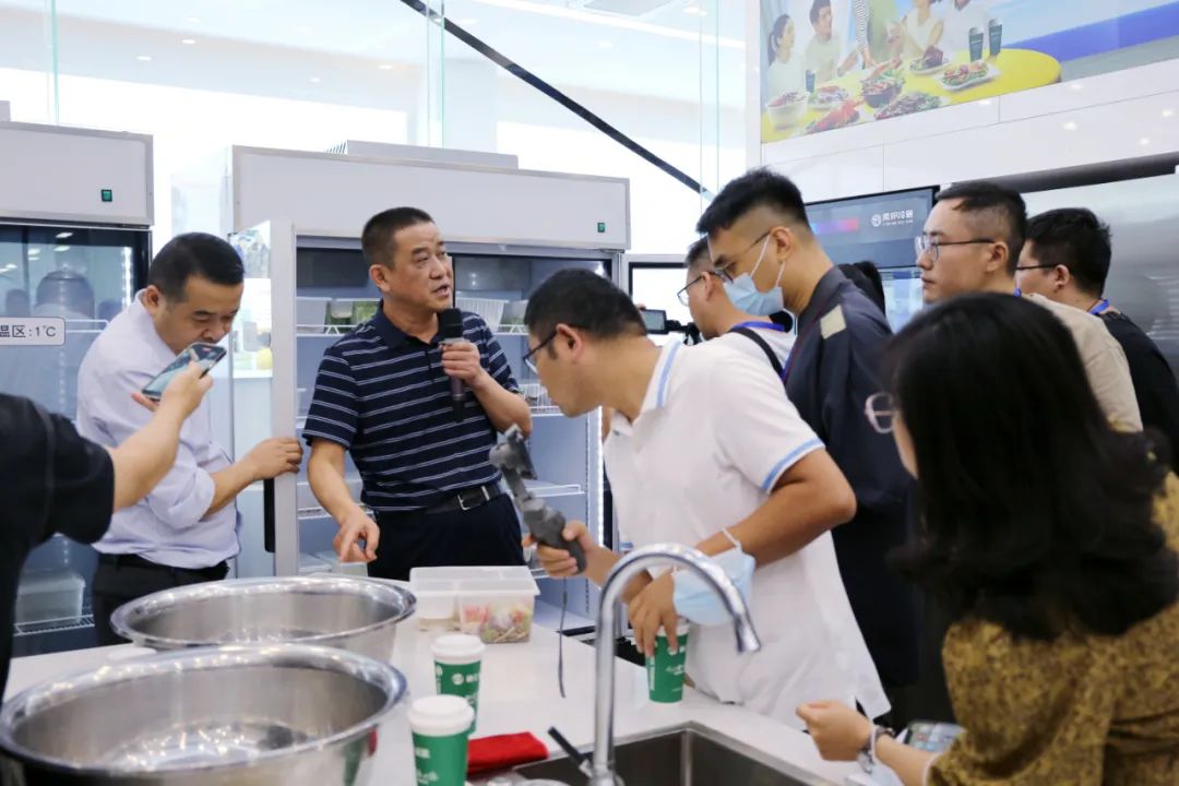 在公司的產(chǎn)品展示廳王瓊峰董事長親自向大家介紹了企業(yè)建廠以來傳統(tǒng)家電產(chǎn)品的發(fā)展和智能轉(zhuǎn)型產(chǎn)品的先進性。尤其在企業(yè)的轉(zhuǎn)型展示廳,董事長用了近一個小時的時間,詳細向全媒體記者們介紹了企業(yè)的發(fā)展歷程,特別是探索升級,智能轉(zhuǎn)型中遇到的困難、總結(jié)出來的發(fā)展要素、分析餐飲業(yè)的現(xiàn)狀,創(chuàng)造性提出二十一世紀餐飲行業(yè)發(fā)展趨勢等,記者們?nèi)褙炞⒙犞v解,不時用鏡頭拍下動態(tài)畫面。