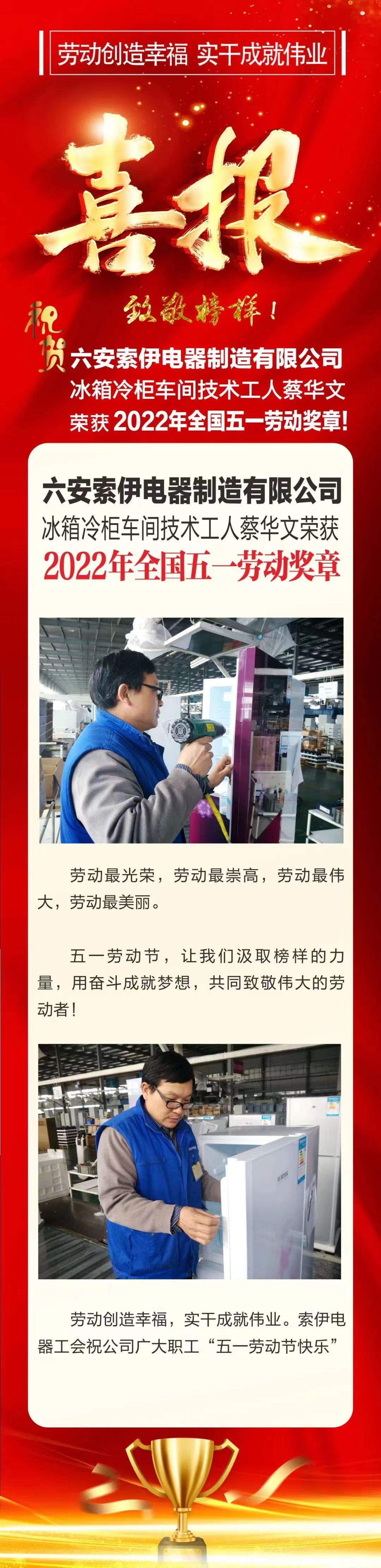 喜報(bào):六安索伊電器制造有限公司冰箱冷柜車(chē)間技術(shù)工人蔡華文榮獲2022年全國(guó)五一勞動(dòng)獎(jiǎng)?wù)拢?/h3>